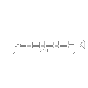 GK219-26A is a wide-format WPC co-extrusion wall panel measuring 219mm by 26mm. Its robust structure and linear design make it ideal for large-scale vertical cladding in residential and commercial facades.