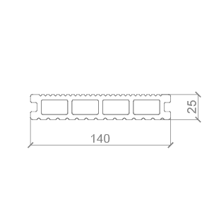 K140-25A is a WPC deck plank with a width of 140mm and a thickness of 25mm. Its rectangular hollow core structure provides strength and stability, making it ideal for outdoor decking and garden walkways.