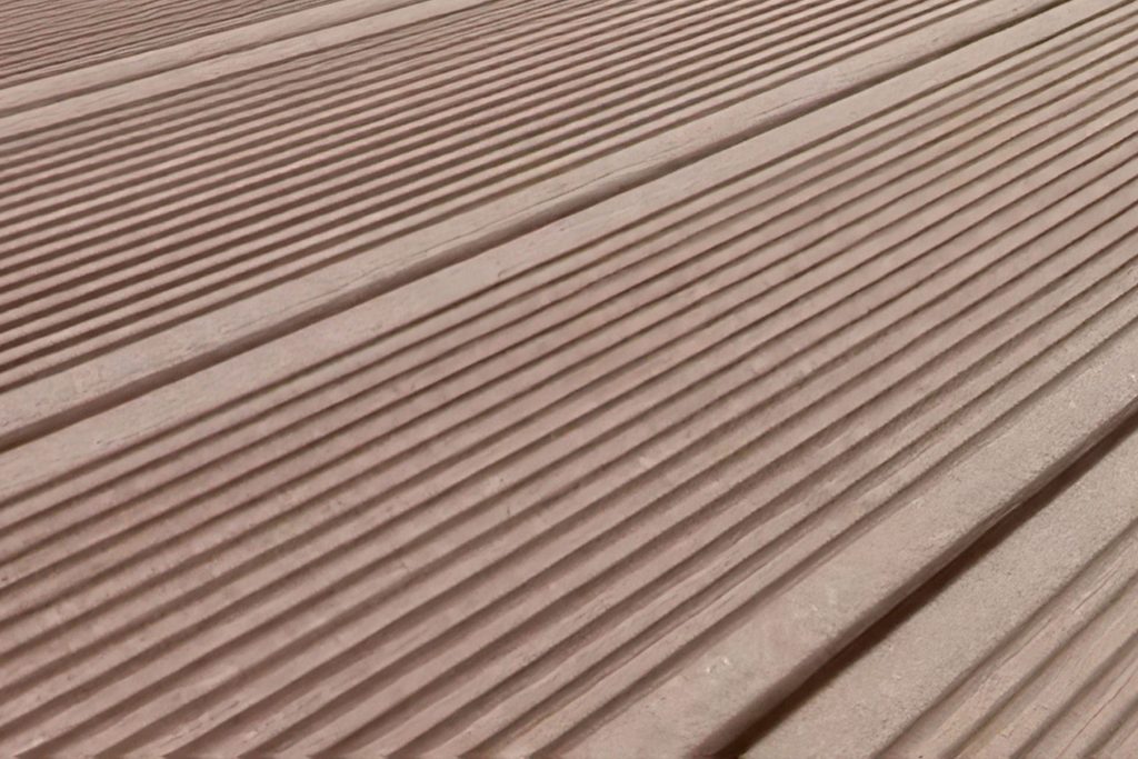 Close-up of brown composite decking boards with parallel grooves. One board is placed diagonally on top of others, showing its profile and textured surface. The decking has a uniform, modern appearance.
