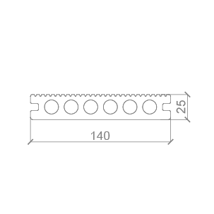 K140-25D is a WPC decking profile measuring 140mm wide and 25mm thick. It features circular hollow cores that reduce weight while maintaining strength, suitable for patios, balconies, and outdoor flooring.