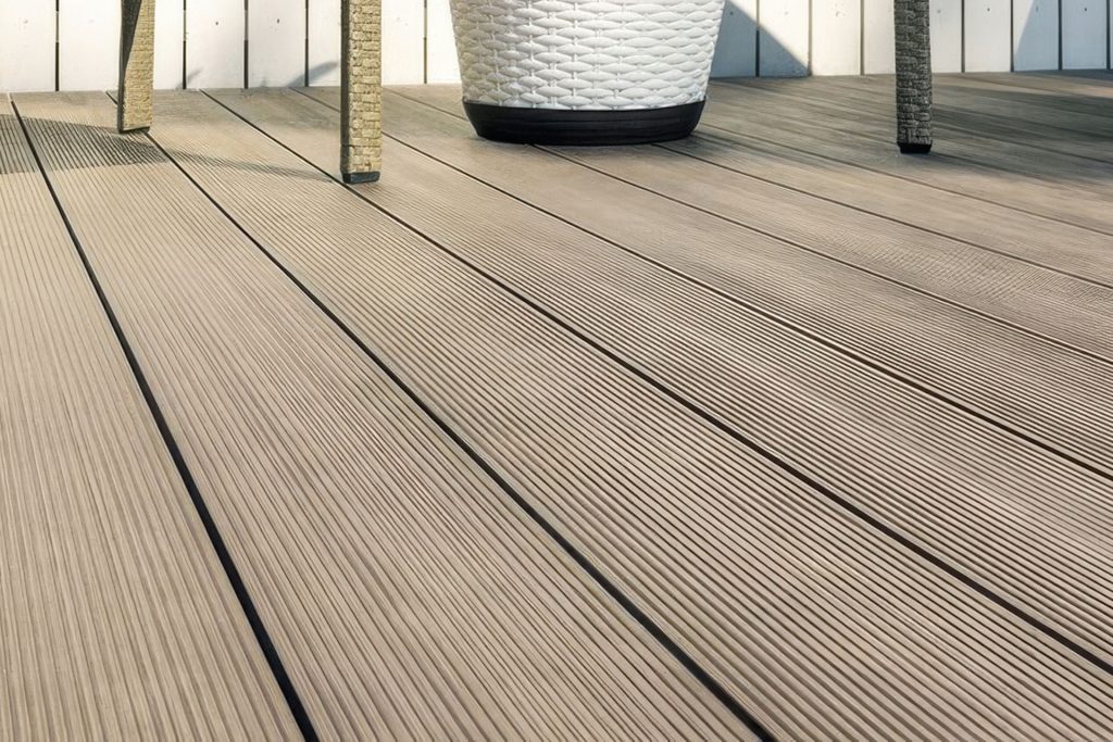 Close-up of brown composite decking boards with parallel grooves. One board is placed diagonally on top of others, showing its profile and textured surface. The decking has a uniform, modern appearance.